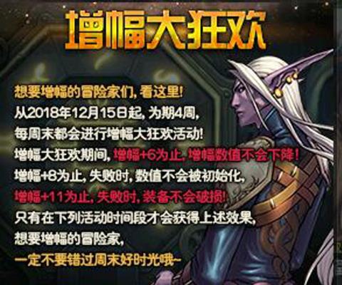 当身上的装备和附魔都已经完美时,你还想追求更强,那么你就只能靠增幅装备来变强,可是装备达到增幅十的等级以后,继续增幅装备就会损坏,装备的增幅保护券又是天价,因此让大部分玩家都止步于增幅十,而这次增幅大狂欢活动带来了一个好消息,就是装备增幅到加十一为止,失败时装备都不会损坏,对于大部分玩家来说,这一点对他们非常重要。因为他们可以借此机会把全身的装备都冲击十一,这个活动给了他们再次变强的机会。