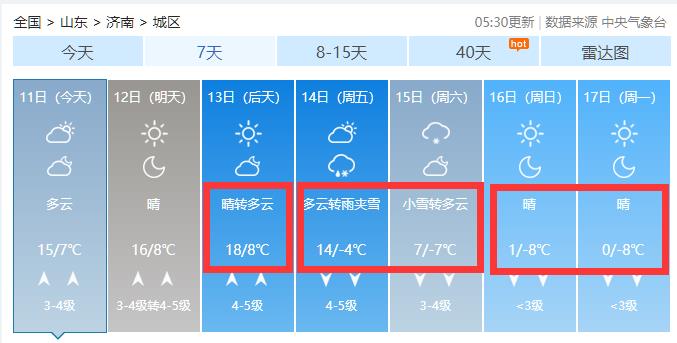 本周济南天气“玩蹦极”:从最高18℃到最低-8℃,还有雨夹雪