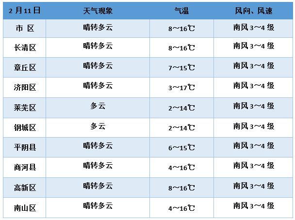 明天夜间到12日多云转晴,南风3~4级,最低气温济阳区、莱芜区、钢城区、商河县、南山区4℃左右,市区及其它区县7℃左右,最高气温16℃左右。