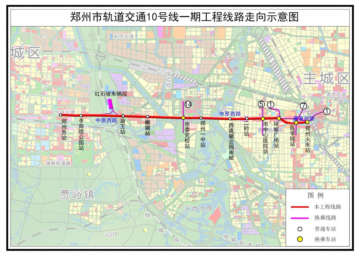 10号线一期起于郑州西站,止于郑州火车站,全长21.849公里,共设12座车站,全部为地下车站,分别为郑州西站、李商隐公园站、庙王站、柳湖站、市委党校站、郑州一中站、西流湖公园南站、二砂站、市中心医院站、绿城广场站、医学院站、郑州火车站。
