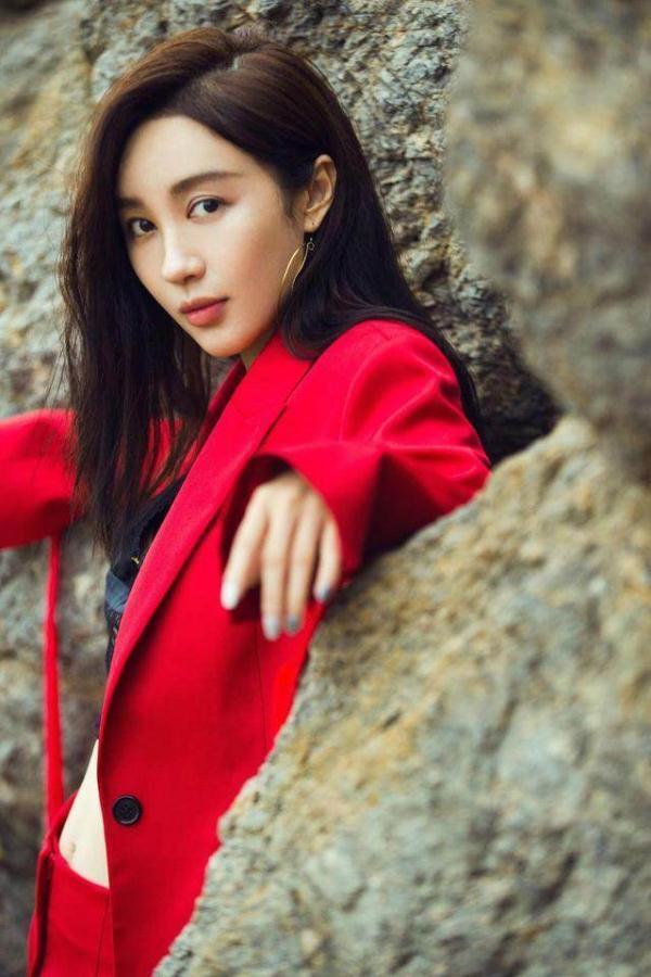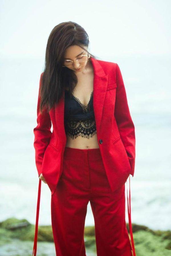 李菲儿时尚写真曝光,粗眉红唇显性感,红色西装大秀好身材!