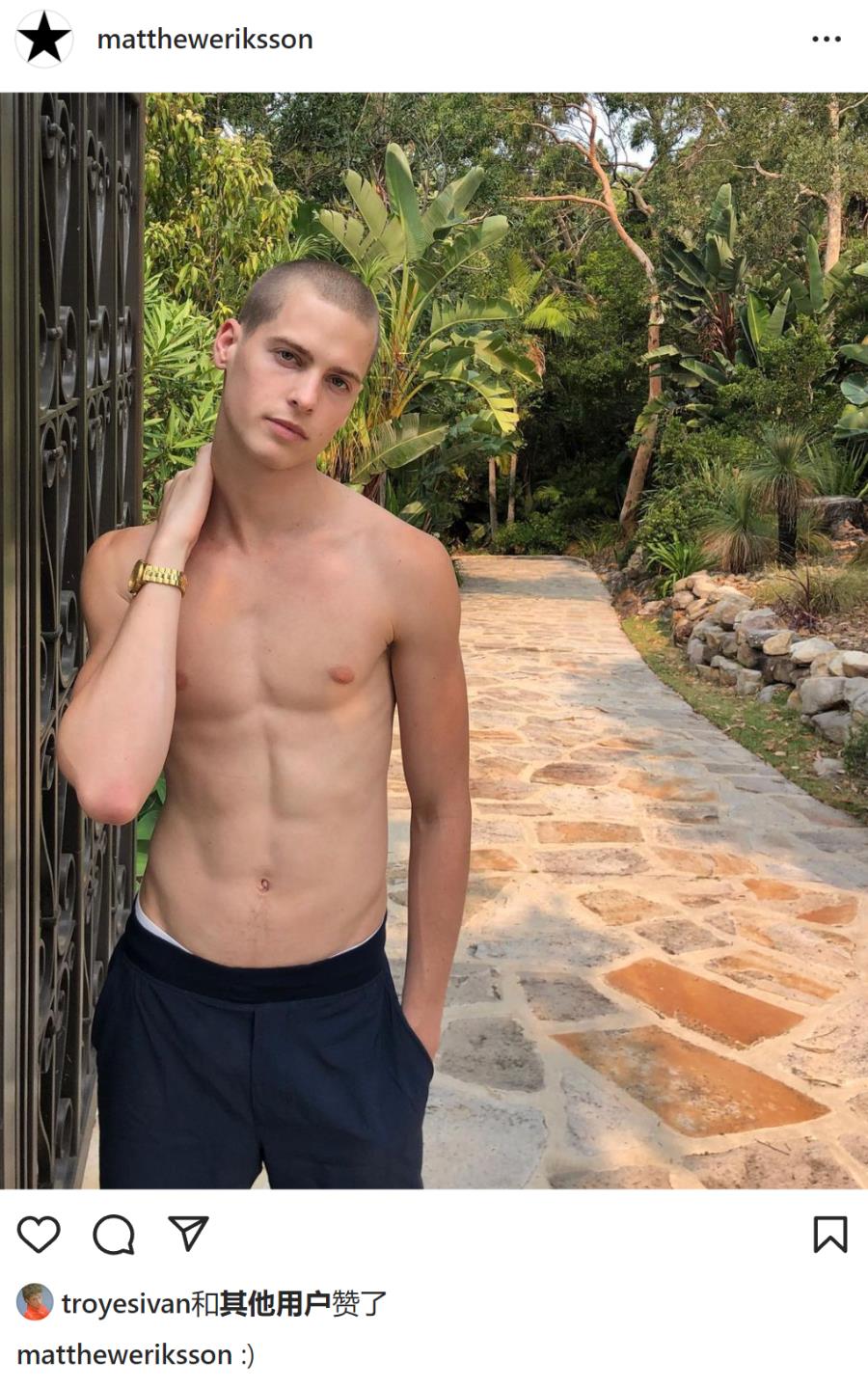 最近,“戳爷”Troye Sivan(特洛伊·希文)在网上冲浪,给澳大利亚时尚男模特 Matthew Eriksson(马修·埃里克森)留下了点赞。