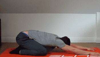 参考瑜伽体式的“婴儿式拉伸”,非常适合身体放松,舒展后背、肩颈、后腰肌肉,动作适用在练习坐位体前屈之前、之后。首先臀部坐在后脚跟上,双手向前伸,身体自然地向前趴下,然后臀部贴住脚后跟,让肩部逐渐下压。