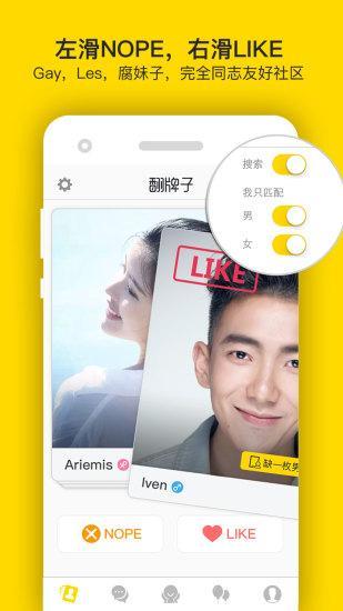 是热门同志配对应用。 Gay、Les、腐女等同志友好人士均可使用。翻牌子每天为你“推荐” 合适的同城对象,你可以: 翻看附近优秀的Gay或拉拉 ,左滑Nope,右滑Like 。