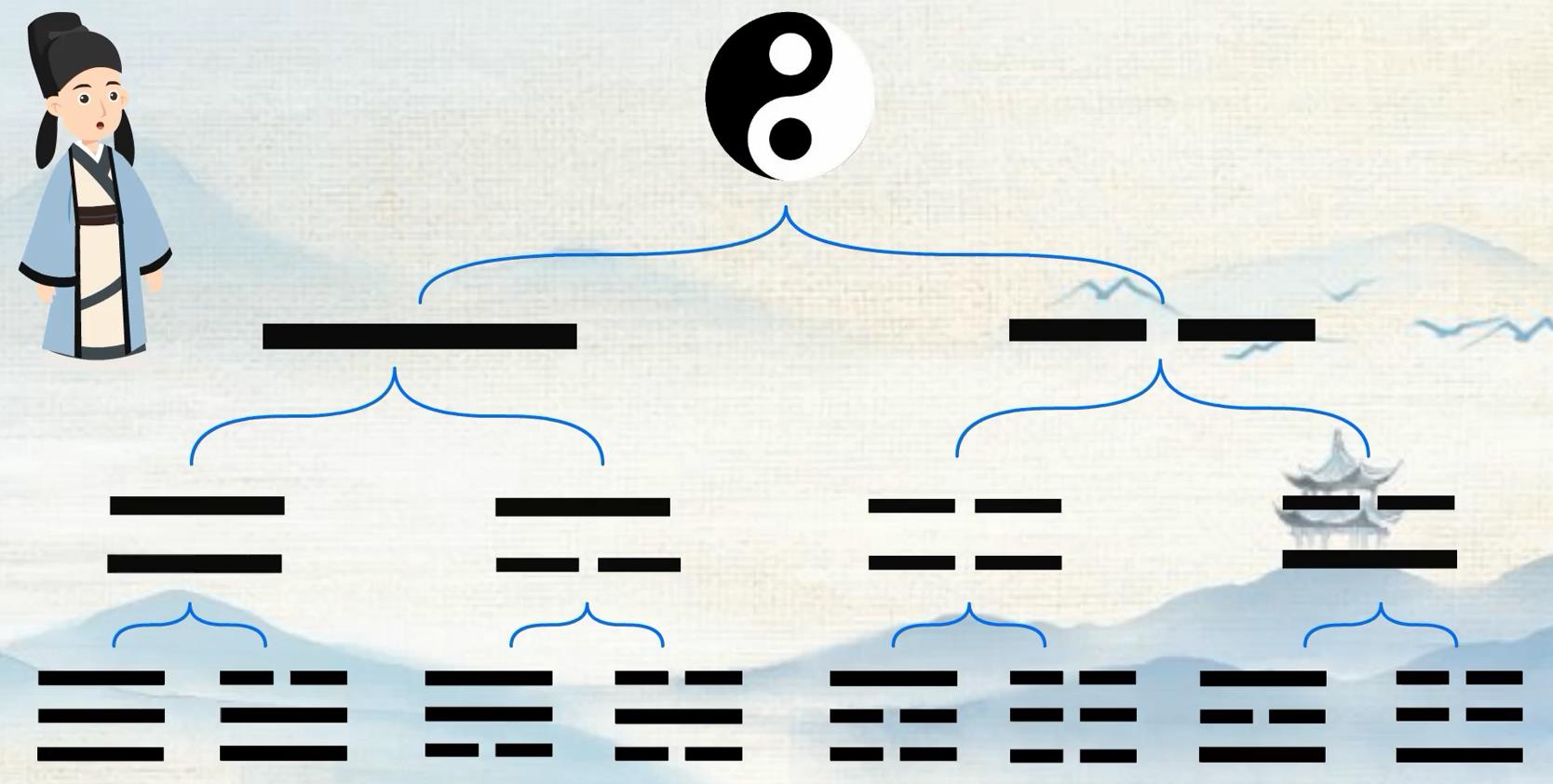 两仪便是一阴一阳,用阴阳两爻来表示,连着的是阳爻,断开的是阴爻,阴阳最开始指的是冬至和夏至,冬至这一天日影最长,夏至这一天日影最短,冬至一阳生,夏至一阴生,冬至和夏至就是太阳回归年的转折点。