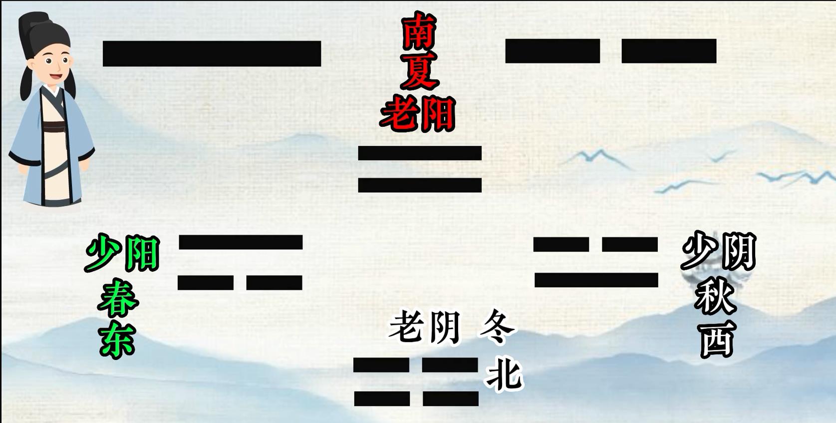 两仪生四象,用阴阳两爻来表示就是,少阳,老阳,少阴,老阴,四象便是春夏秋冬,在方位上表示东、南、西、北,青龙、朱雀、白虎、玄武。