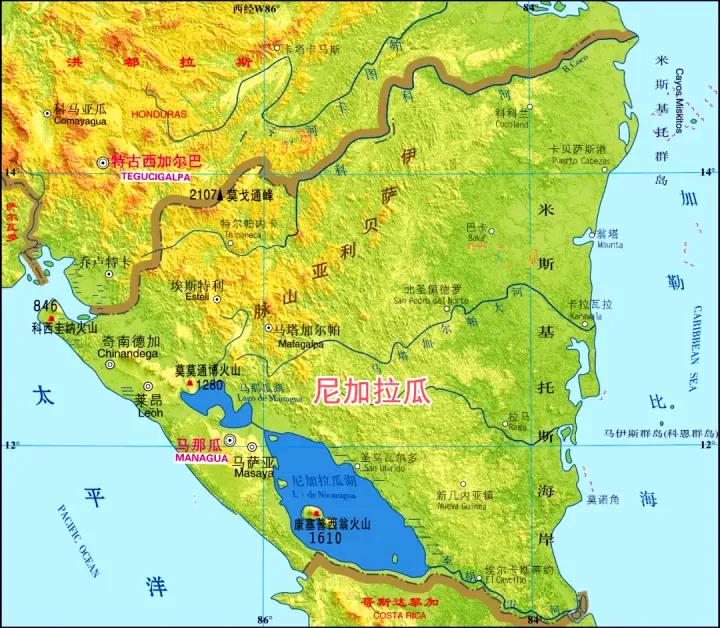 尼加拉瓜地峡位于尼加拉瓜,此处地峡在宽度上并没有什么优势,总长在240公里左右,但这里有个最大的好处就是水资源丰富,中间有个大大的尼加拉瓜湖,为运河提供了充足的水源,且南部边缘有一条圣胡安河从湖中流出直通加勒比海,从大西洋一侧可乘船直达尼加拉瓜湖。历史上,在巴拿马运河开通之前,这条线路就是大西洋和太平洋最常用的往来线路之一。尼加拉瓜地势大部分相对平坦,也为运河的修建提供了有利条件。