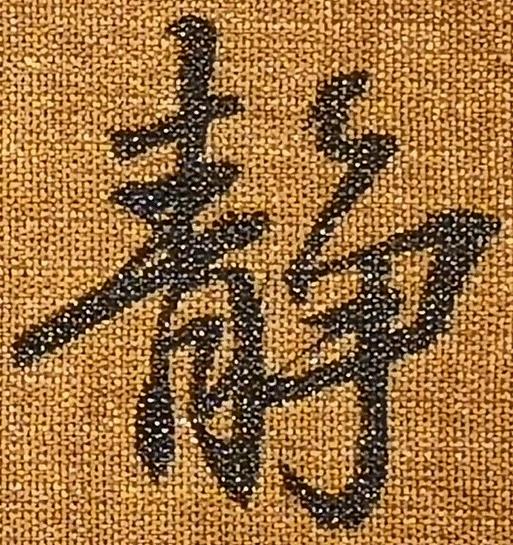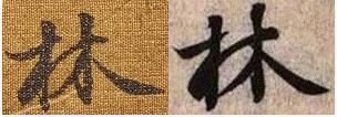 以下两张照片显示宋徽宗鉴定为真迹的《兰亭序》书法是临写的,其中墨迹中的白点是照片放大后丝绢后装裱的衬纸白色和古绢上常见的白色结晶小颗粒所形成的。