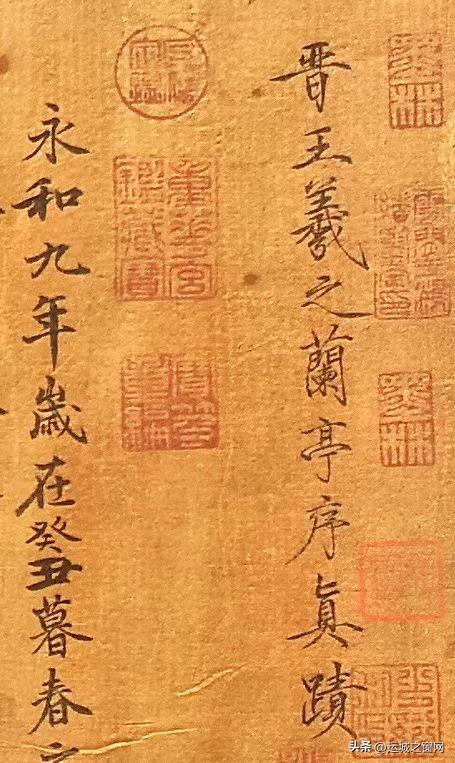 3、宋徽宗鉴定为王羲之真迹的这幅《兰亭序》有宋徽宗做鉴定题跋加持。宋徽宗能看到王羲之书法真迹可与唐太宗相提并论,以宋徽宗的阅历和在书法上的造诣,鉴定题跋这一幅《兰亭序》是王羲之真迹肯定是有所依据的,我们就此与冯承素《兰亭序》摹本比较,可以看出宋徽宗真是功力深厚、慧眼识珠。这幅《兰亭序》除了宋徽宗的鉴定题跋,还有元代著名书画家、收藏家、鉴定家柯九思收藏并钤“柯氏精玩”印,明代大收藏家、书画家项子京收藏并钤“项子京家珍藏”、“墨林”等印,明代大书法家王穉登鉴识钤“广长庵主”印,清代著名书法家、鉴定家王鸿绪鉴定并钤“云间王鸿绪鉴定印”。此书法为清代宫廷收藏,清宫廷有多枚钤印,其中乾隆时期所编“石渠宝笈”收录。由此可见,其收藏与传承脉络清晰。
