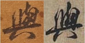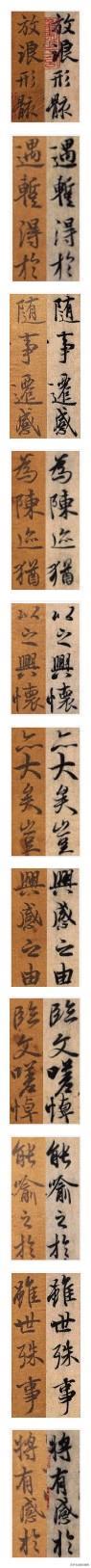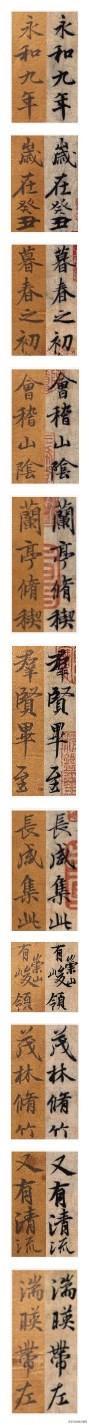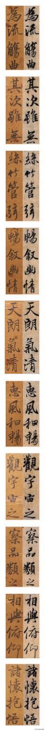 以下图片是宋徽宗鉴定为真迹的这幅《兰亭序》书法与冯承素《兰亭序》摹本书法的比较,右边金色的为宋徽宗鉴定为真迹的这幅《兰亭序》书法,左边的为冯承素《兰亭序》摹本书法。