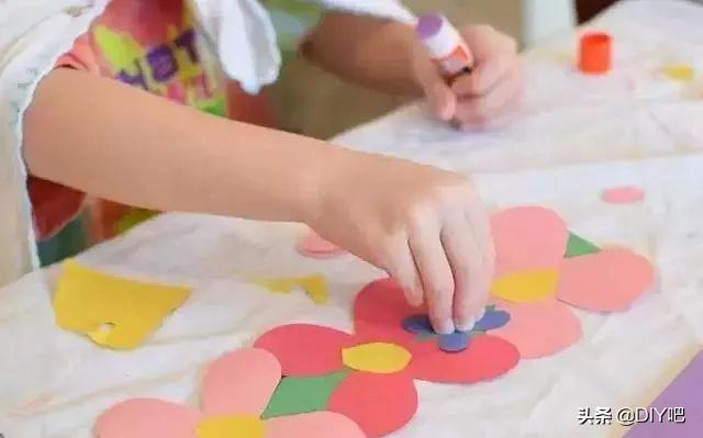 把花瓣和花蕊、绿叶粘在一起,组成完整的花朵