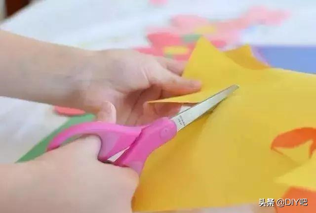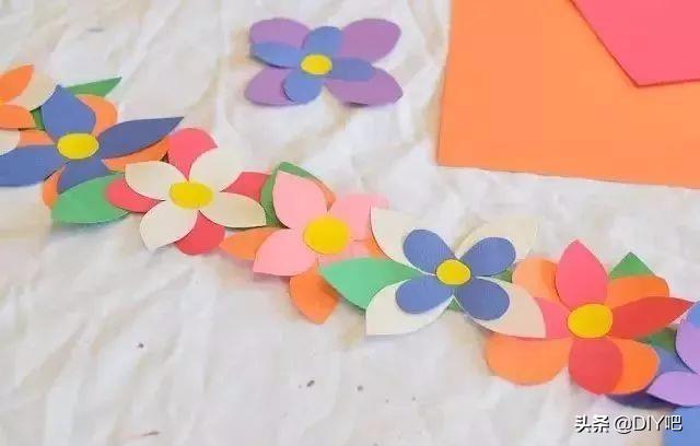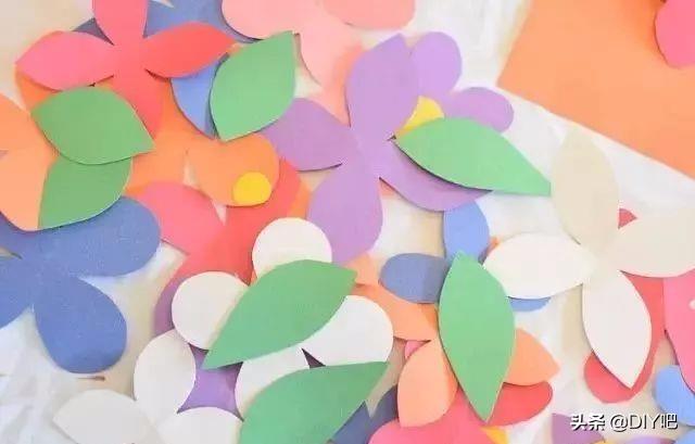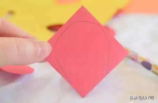 剪几个不同颜色的正方形卡纸,折成 1/4 大小,如上图画一个花瓣形状并裁剪,注意中心处不要剪开。展开卡纸,四瓣花轮廓就出来了