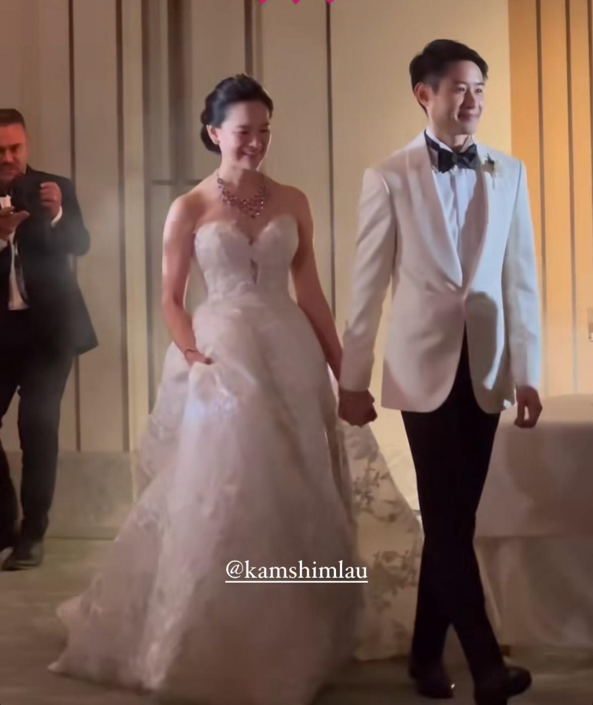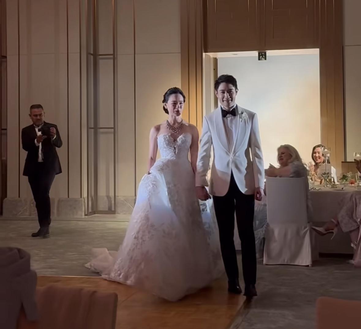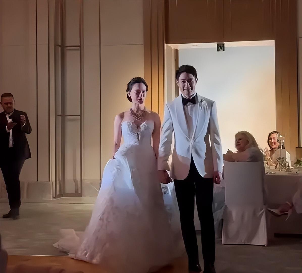 这场婚礼低调却不失盛大,从曝光的影像资料可以看出,近百人的参与规模堪称大型。婚礼在当地一家豪华酒店的宴会厅举行,采用了西式宴会的形式,长桌宴席摆放整齐,以西餐为主食。宾客们分别坐在宴会厅两侧的长桌前,而中间则为新人留出了走红毯的宽敞空间。与传统仪式不同的是,新娘刘今蟾并非由父亲挽着手进场,而是与新郎直接手牵手步入会场。她身着白色抹胸婚纱,胸前那串红宝石项链格外引人注目,简约中尽显高贵气质。精致的妆容让她与平日判若两人,若非熟悉之人,几乎难以辨认。
