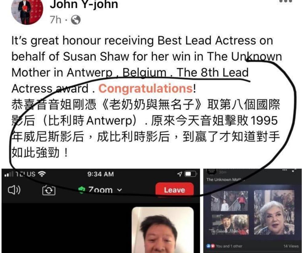 今年,邵音音已经70岁了,她的好友发文恭喜她凭借《老奶奶与无名子》,在国际影展连夺八个国际影后。