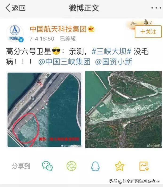 7月4日,@中国航天科技集团发微博称:“高分六号卫星:亲测,三峡大坝没毛病!!”