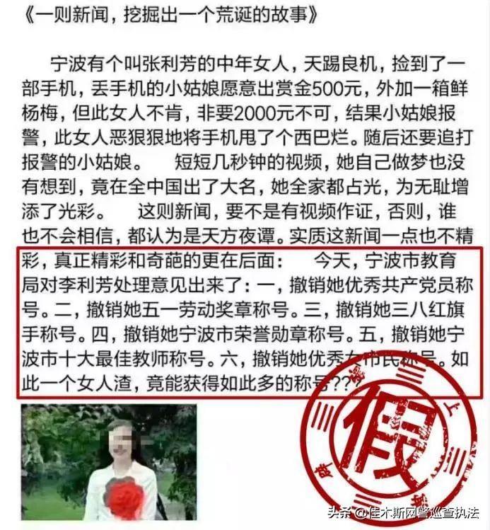 近日,一个题为《一则新闻,挖掘出一个荒诞的故事》的帖子截图在网上热传,讲述宁波中年女子“张利芳”捡到一部手机,向失主索要高额酬金的故事。失主无奈报警,“张利芳”立刻砸烂手机,甚至还要追打失主。据人爆料,“张利芳”竟然在当地获得过优秀共产党员、五一劳动奖章、优秀女市民等一系列荣誉。