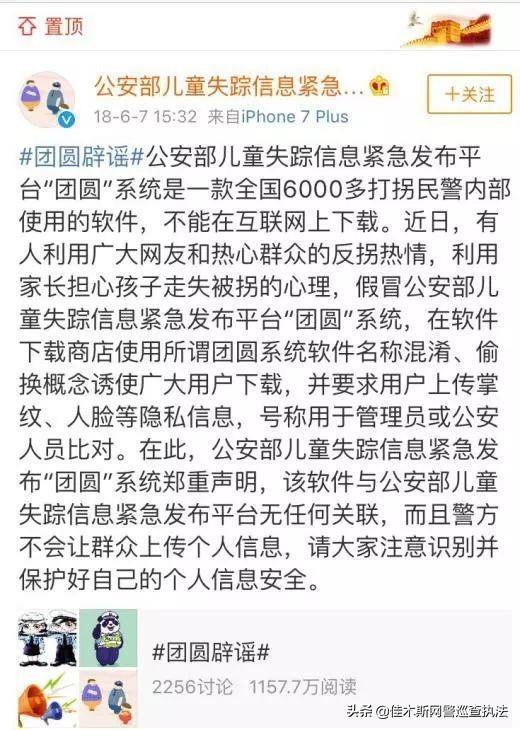 事实上,@公安部儿童失踪信息紧急发布平台在去年6月初就辟谣称:“团圆”系统一款打拐民警内部使用的软件,不能在互联网上下载。