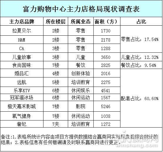 根据项目方提供的数据结合实地踩盘,赢商网发现在成都富力广场购物中心25万平方米的商业面积中,分布有12家主力店。其中,零售业态占比17.54%,儿童业态占比12.32%,餐饮业态占比9.54%。