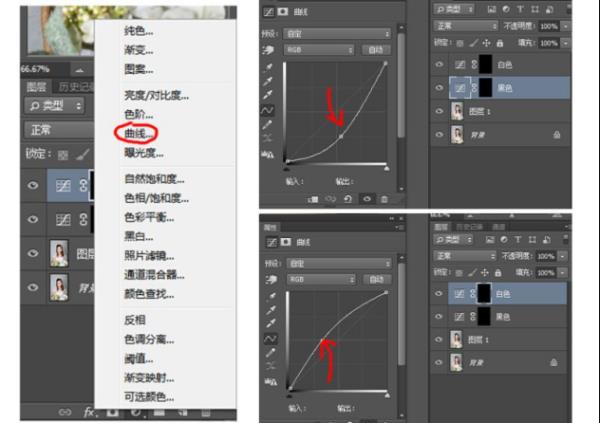 新建两个曲线调整图层,一个命名为白色曲线往上拉,建立图层蒙版填充黑色;一个命名为黑色曲线往下拉,建立图层蒙版填充黑色。只使用白色柔角画笔,透明度30%流量10%进行绘制,