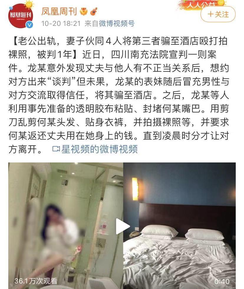 今天刷到一则新闻,说的是四川一龙姓女子在发现老公出轨后,伙同4人将第三者骗至酒店殴打拍裸照,结果被判有期徒刑1年。