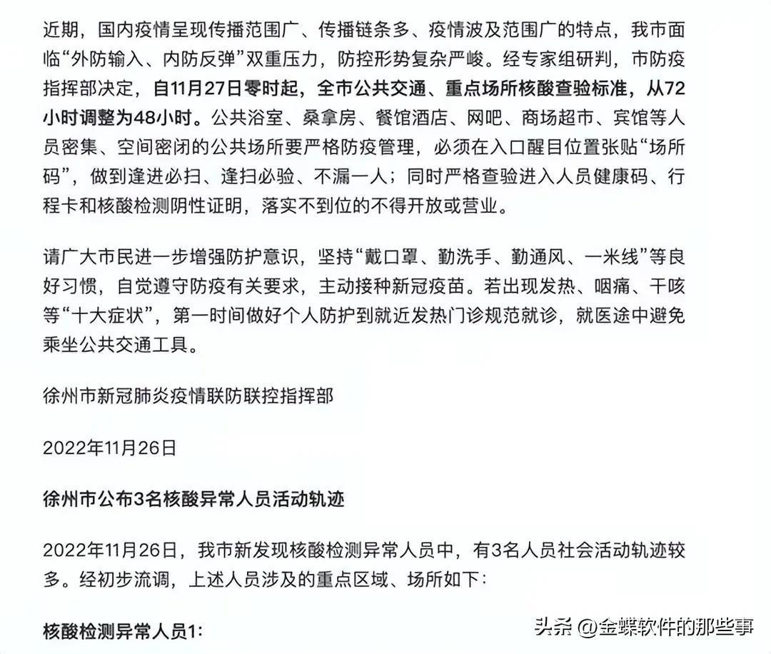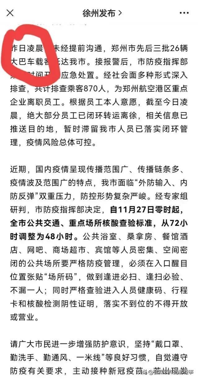 现在徐州因为这个情况已经连续三天全员核酸了,全市公共交通、重点场所核酸查验标准也从72小时调整到了48小时。