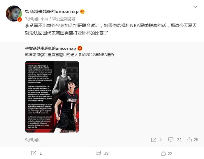 近日韩国男篮未来之星李贤重官方宣布,他将聘用经纪人报名参加2022年的NBA选秀大会!很快据欧洲篮球及NBA选秀专家王健报道,如果不出意外的话,李贤重大概率将参加在芝加哥进行的联合试训,而且李贤重很有可能打夏季联赛,如此一来李贤重也就没有办法回国代表国家队参加亚洲杯的比赛了。