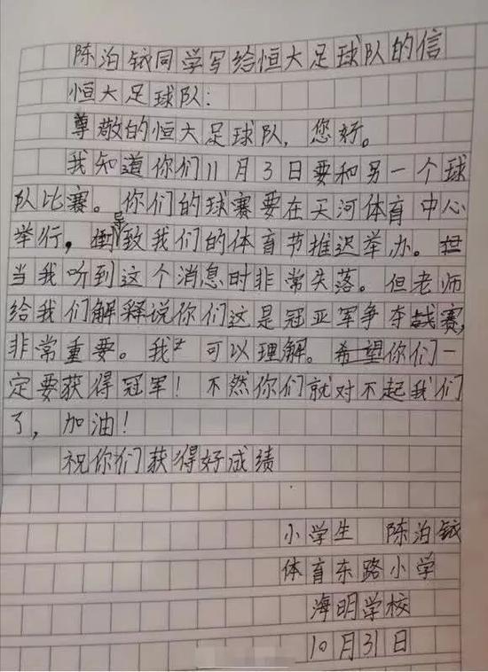 “尊敬的恒大足球队,您好。我知道你们11月3日要和另一个球队比赛。你们的球赛要在天河体育中心举行,导致我们的体育节推迟举办。当我听到这个消息时非常失落。但老师给我们解释说你们这是冠亚军争夺赛,非常重要。我可以理解。你们一定要获得冠军!不然你们就对不起我们了,加油!祝你们获得好成绩。”