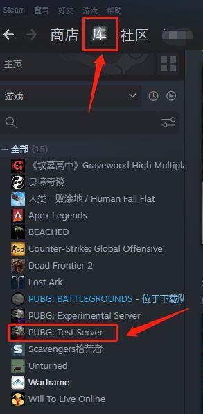 3.点击左上角“库”找到库中的游戏,购买过或者安装了PUBG玩家已经同步将测试服入库了,找到库中的PUBG:Test Server后进入游玩即可;