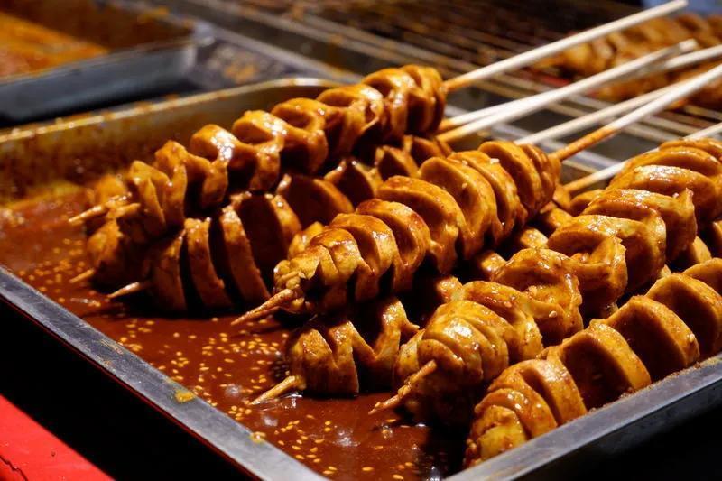 这里有十块钱十五串的烤面筋、七八块钱的炸串夹馍,十块钱就可以吃到的水果捞,还有章鱼小丸子,麻辣烫,臭豆腐,奶茶等等,你想到的小吃这里都有。
