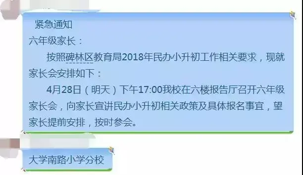 今天下午,已经有部分小学六年级的家长收到学校通知,主题为2018小升初民办升学政策说明会,目前收到通知的学校为庆安小学、大学南路小学分校、西电附小等,所涉及的学校区域为碑林区、莲湖区、雁塔区。相关通知内容分享内容如下: