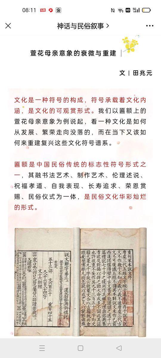 又到了母亲节,著名民俗学家、华东师范大学田兆元教授再次在他的公众号中发表《萱花母亲意象的衰微与重建》一文,呼吁“复兴中国孝道文化,应该重新认识萱草的文化符号价值,振兴萱花文化”,“建立中国的母亲节,传承重建中国的萱草母亲花意象,对于建立文化自信具有重要意义。”本文最早发表于2019年6月30日的《光明日报》,田教授每年母亲节前都要重发一遍。