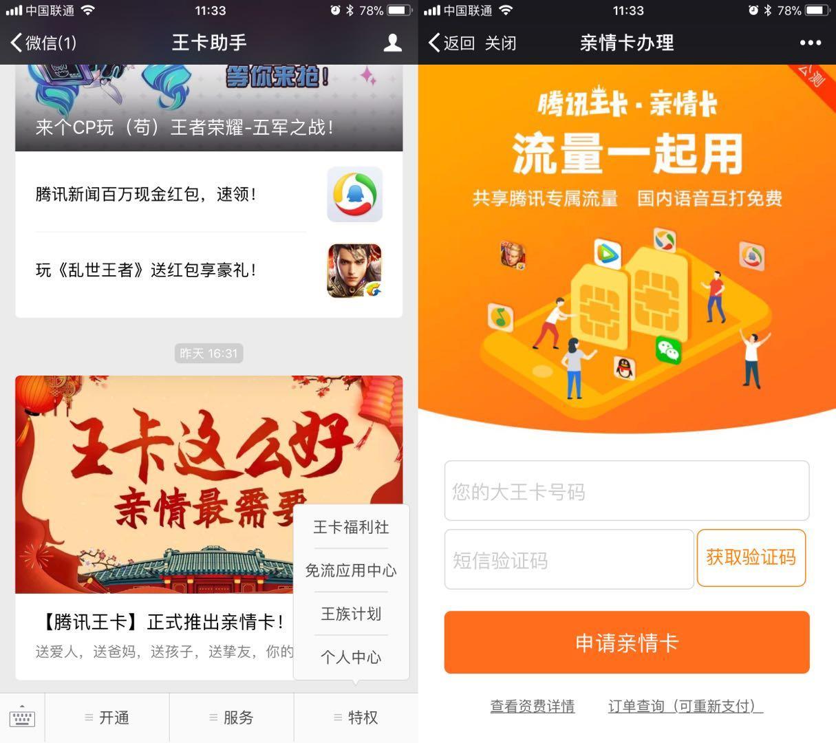 腾讯王卡亲情卡的申请入口为:王卡助手微信公众号——特权——个人中心——申请亲情卡。