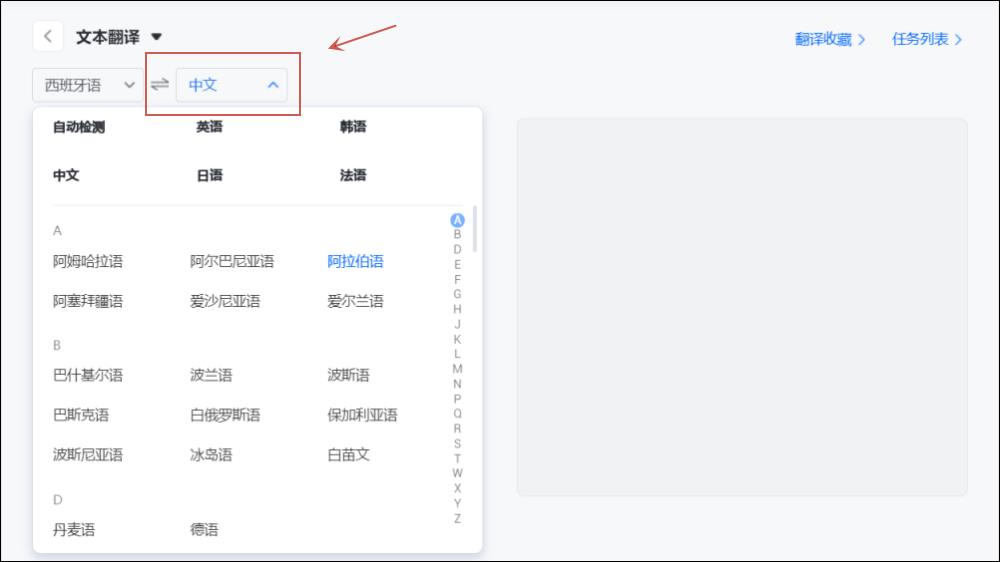 现在进入文本翻译界面。如果我们想要翻译文本内容,首先要注意设置好需翻译前后的语言。