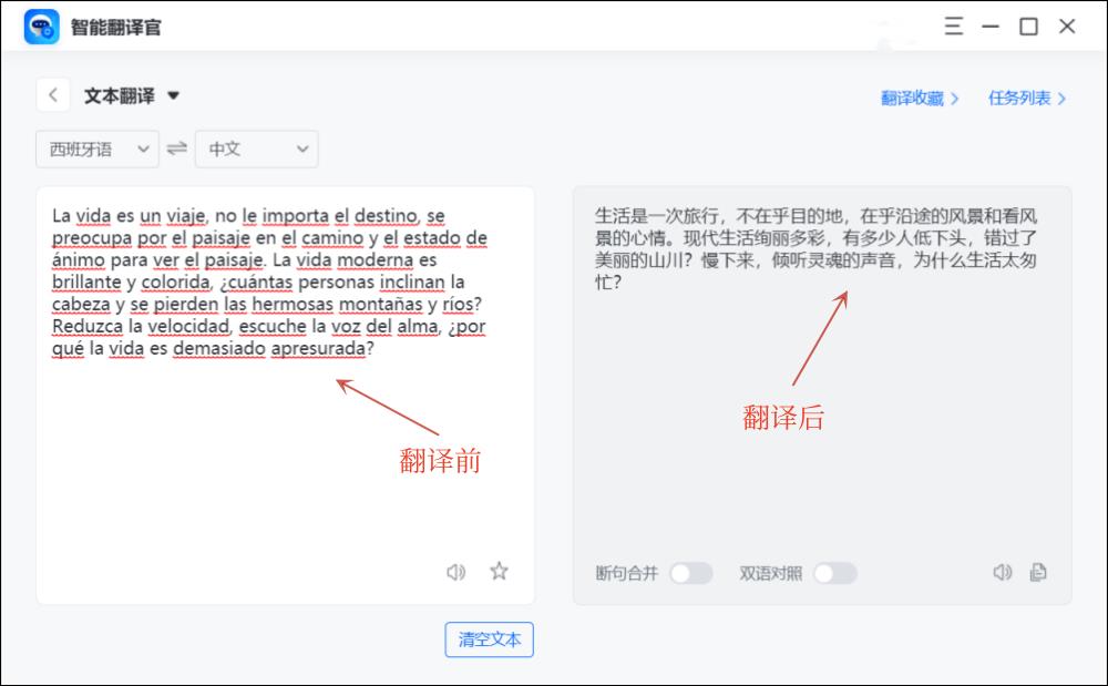 借助专业的翻译器【智能翻译官】来完成中文西班牙语的翻译。