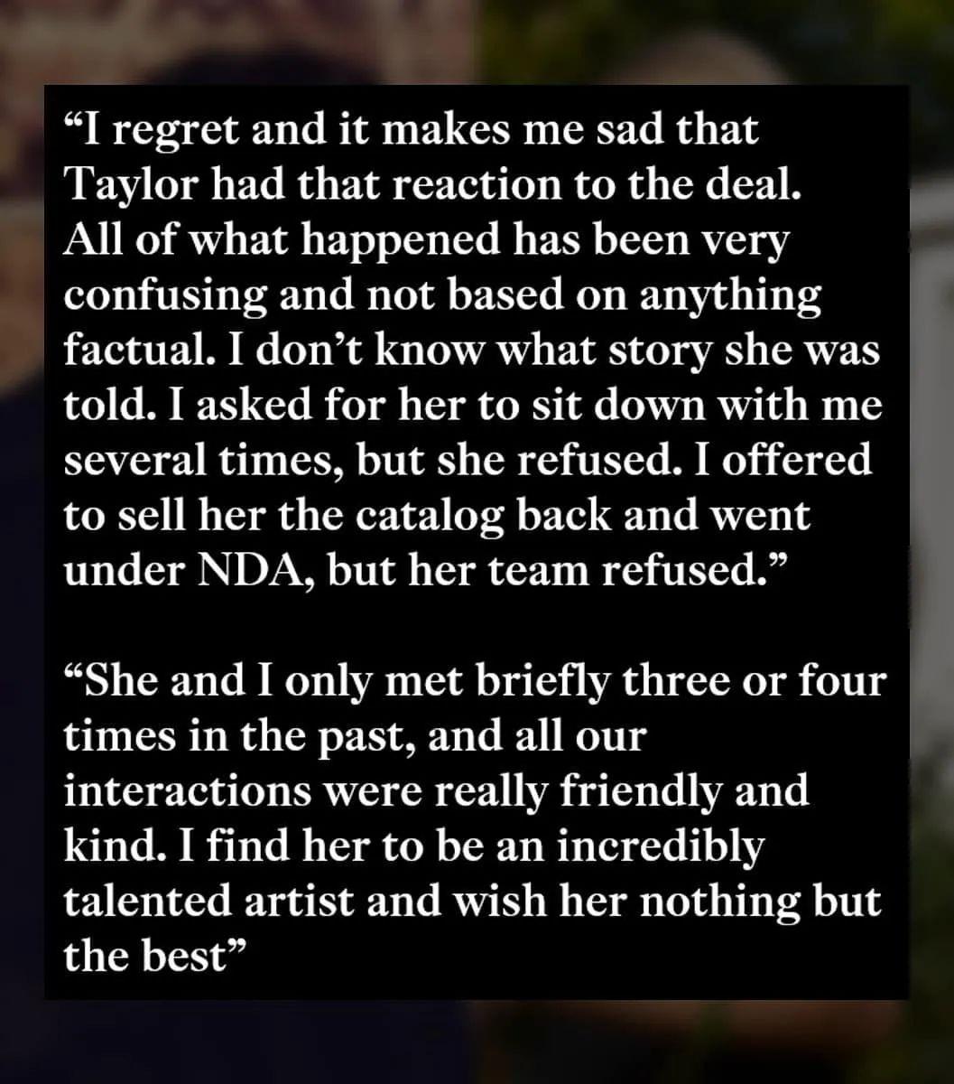 本次,斯库特·布劳恩在杂志里的采访谈及了霉霉泰勒·斯威夫特(Taylor Swift)以及她掌握了霉霉前五张唱片版权的事情。