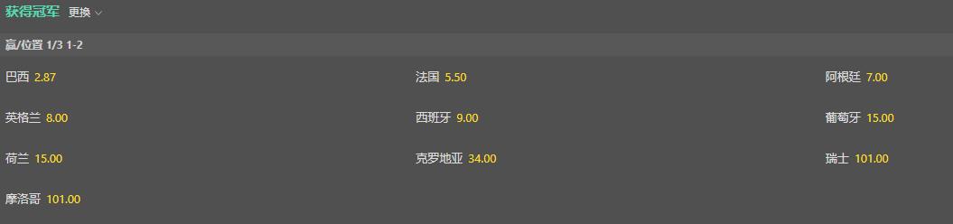 世界杯夺冠赔率:巴西降至2.87!法国第2是其两倍,阿英第3第4