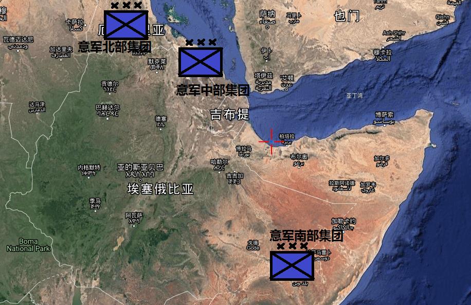 而在南部战场,即属索马里方向,有两个战役集群,约11万人,由格拉乔亚尼将军指挥,其中还包含有坦克45辆、汽车1850辆、火炮117门、飞机38架。除此而外,中央方向也编有一个1.7万人的战役辅助集群。后两个集群的目标都是为了吸引埃军注意并策应北部战场。