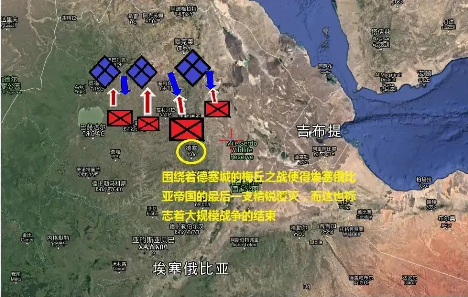 而就在南路意军得手的同时,北部意军也开始动作,从1月20-27日,巴多里奥连续发起两次泰姆比恩战役、恩德尔塔战役以及安巴阿拉达姆战役,这一举动重创了北部的埃塞俄比亚军队,兵锋直指德塞。不得已,塞拉西在权衡后决心率最后的中央预备队北上与意军决一死战,毕竟德塞一丢,则首都亚的斯亚贝巴就将无险可守。1936年3月31日,塞拉西在梅丘(也译迈丘)率领包括皇帝卫队在内的十万埃塞俄比亚军向北部意军展开了殊死进攻,战斗期间甚至塞拉西本人也亲自操作机枪对意军进行猛烈射击。但无奈在北部意军飞机、大炮和机枪的轮番绞杀下,埃军虽勇却无力回天,最终埃军向德塞方向撤退。