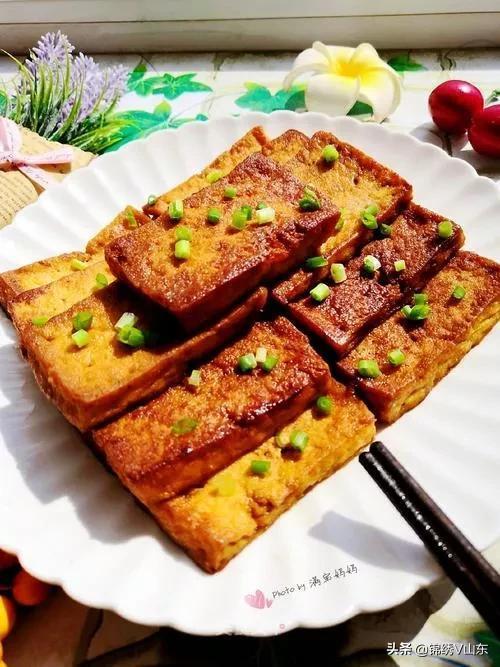 1.豆腐切1㎝厚3㎝左右大小的方块,放油锅里,中火两面反复煎成金黄色;