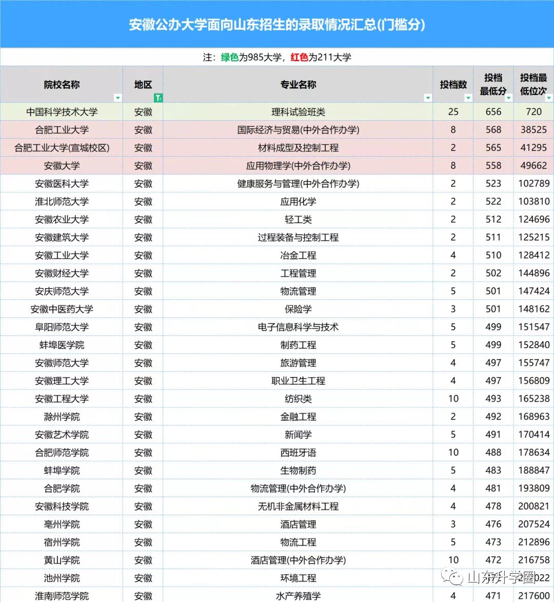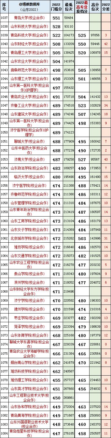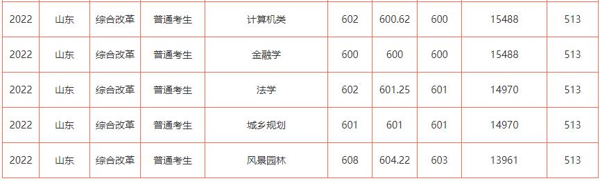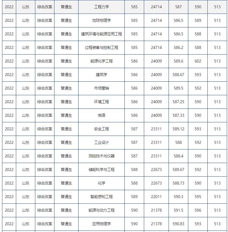 各院校2022年在鲁录取分数线: