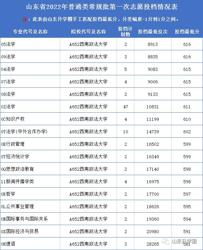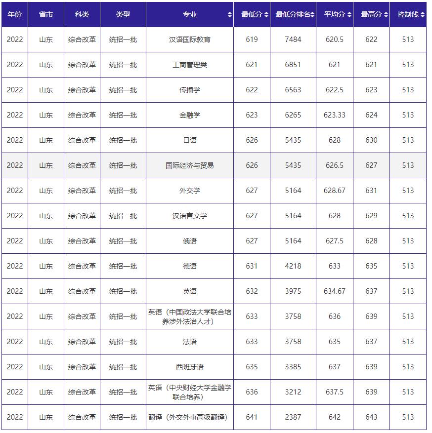 中国政法大学2022年在山东专业录取分数线: