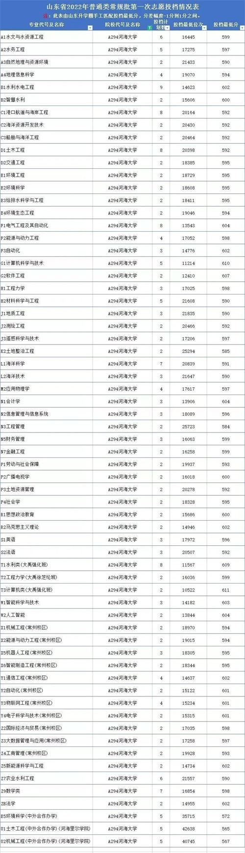 河海大学2022年在山东专业录取分数线:
