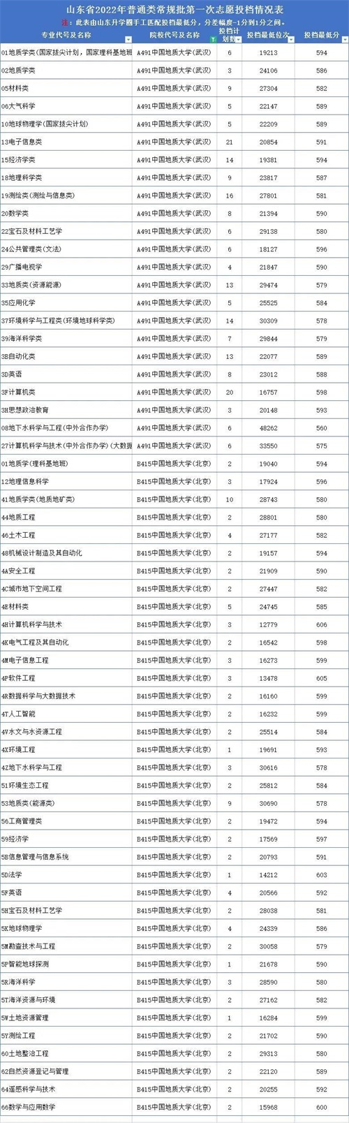 中国地质大学2022年在山东专业录取分数线: