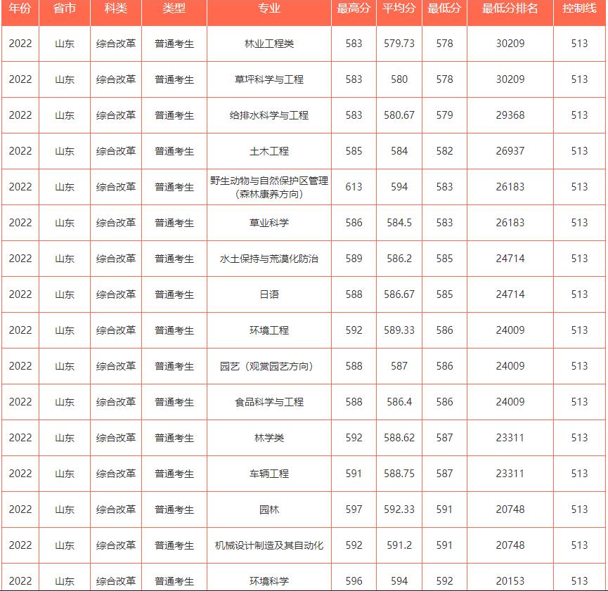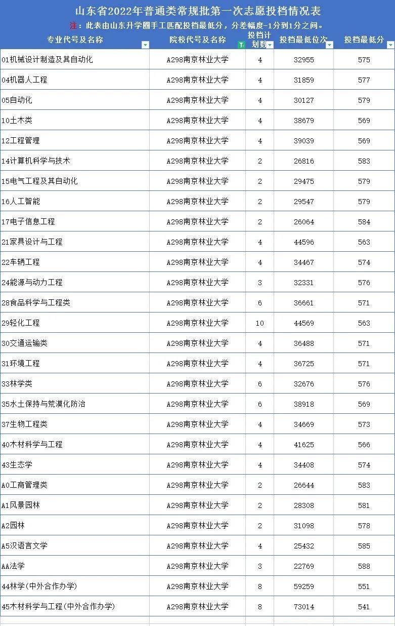 南京林业大学2022年在山东专业录取分数线:
