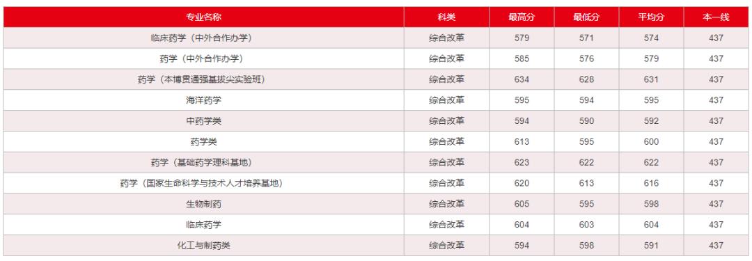中国药科大学2022年在山东专业录取分数线: