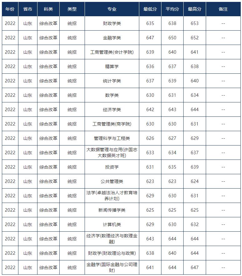 中央财经大学2022年在山东专业录取分数线: