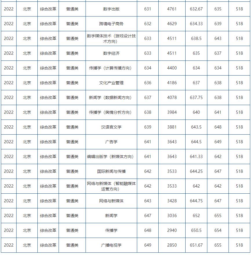 中国传媒大学2022年在山东专业录取分数线: