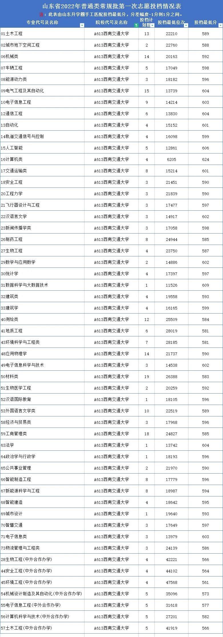 西南交通大学2022年在山东专业录取分数线: