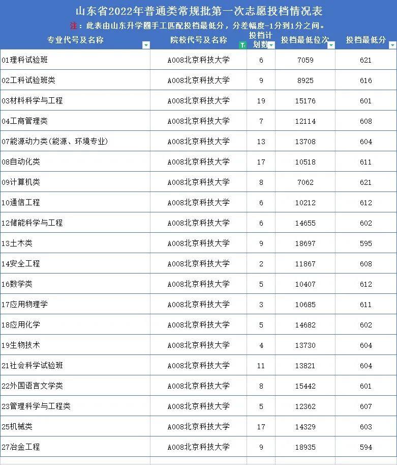 北京科技大学2022年在山东专业录取分数线: