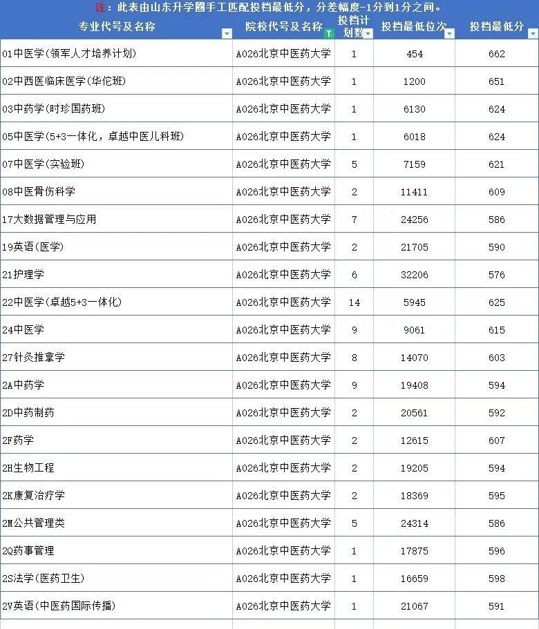 北京中医药大学2022年在山东专业录取分数线: